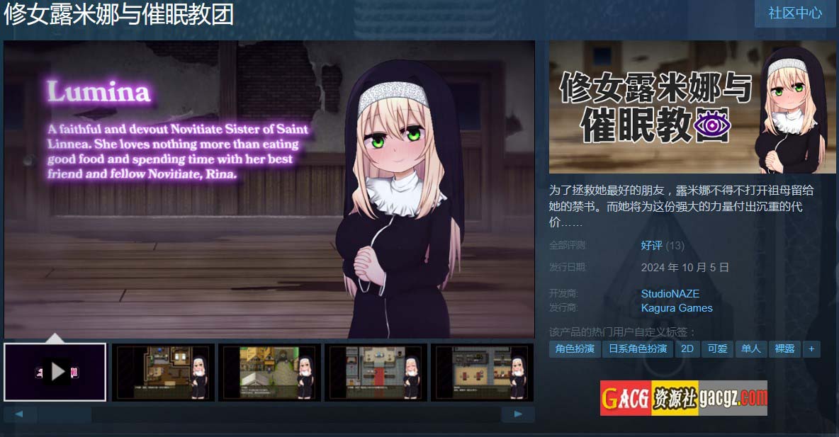 《修女露米娜与催眠教团》是一款由Steam平台发行的日式角色扮演游戏,大小约为709M,支持官方中文。 游戏讲述了修女露米娜在一个神秘的修道院中发现了一群被称为“催眠教团”的堕落者,并利用自己的催眠技能与他们展开对决的故事。游戏结合了经典的RPG元素和独特的心理操控机制,为玩家呈现了一场充满悬疑与反转的奇幻冒险。